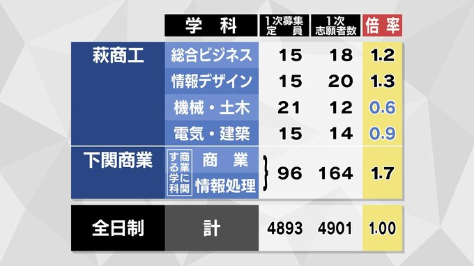 【全校掲載】山口県公立高校入試2026志願状況調査志願倍率発表 全日制はちょうど1倍 徳山・文理探究(理数)2.3倍 山口・文理探究1.4倍 【2月12日発表】 テレビ山口 2026年2月12日(木) 16:29 国内 萩・普通は0.8倍 萩商工・情報デザインは1.3倍