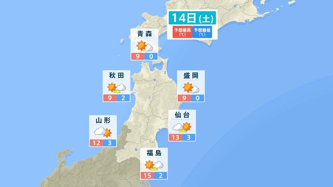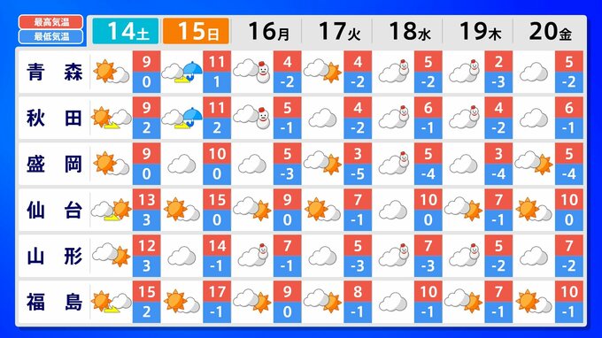 東北地方の向こう2週間の気温は、寒気の影響を受けにくいため高い日が多く、15日頃と20日頃からはかなり高くなる見込みです。