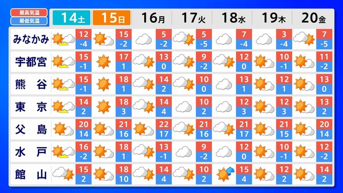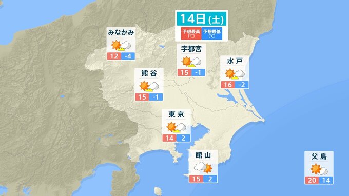 関東甲信地方の向こう2週間の気温は、寒気の影響を受けにくく暖かい空気が流れ込みやすい時期があるため高い日が多く、20日頃からはかなり高くなる見込みです。