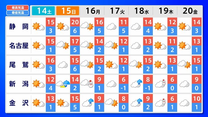 東海地方の向こう2週間の気温は、寒気の影響を受けにくく暖かい空気が流れ込みやすい時期があるため高い日が多く、21日頃からはかなり高くなる可能性があります。