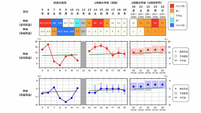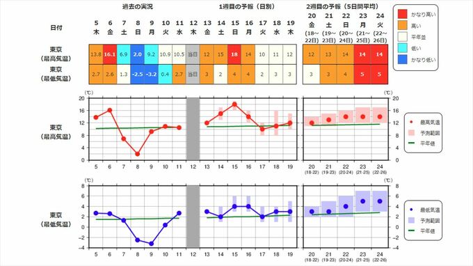 関東甲信地方の向こう2週間の気温は、寒気の影響を受けにくく暖かい空気が流れ込みやすい時期があるため高い日が多く、20日頃からはかなり高くなる見込みです。