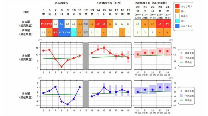 東海地方の向こう2週間の気温は、寒気の影響を受けにくく暖かい空気が流れ込みやすい時期があるため高い日が多く、21日頃からはかなり高くなる可能性があります。