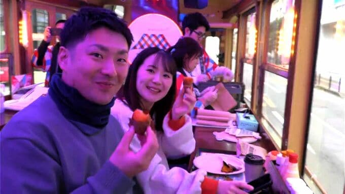 鹿児島市電に乗って焼き芋を食べながら街をめぐる「マグマやきいも電車」の運行が今年も始まりました。「マグマやきいも電車」は、鹿児島市のマグマシティのロゴをイメージしたLEDで光り輝く特別装飾の路面電車で…