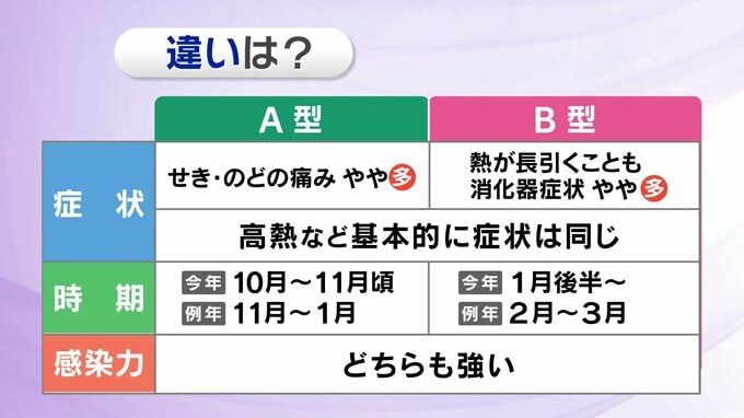 A型もB型も、基本的には高熱が出るなど、症状に違いはないそうです。ただ、熱の症状が長引いたり、嘔吐や下痢など消化器症状を訴えたりする人は、B型の方がわずかに多いそうです。感染力については、A型の方が強いという報道もありますが、実際のところ大きな違いはなく、どちらも強いとのことなので、「B型だから相手にうつしづらいだろう」などと考えていたら、注意しましょう。