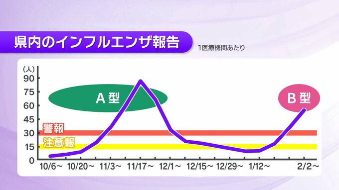 2度目の流行となっているインフルエンザですが、1回目の流行となった去年11月ごろは「A型」が猛威を振るっていました。しかし、今回の流行は「B型」に置き換わっています。