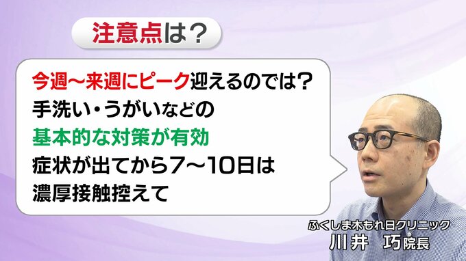 川井先生によると、今週から来週ごろには流行のピークを迎えるのではと話していました。手洗い・消毒・うがいといった基本的な感染対策の徹底はもちろん、症状が出た日から7~10日程度は、家族など一緒に住んでいる人以外との濃厚接触を控え、うつさない対策も大切だということです。