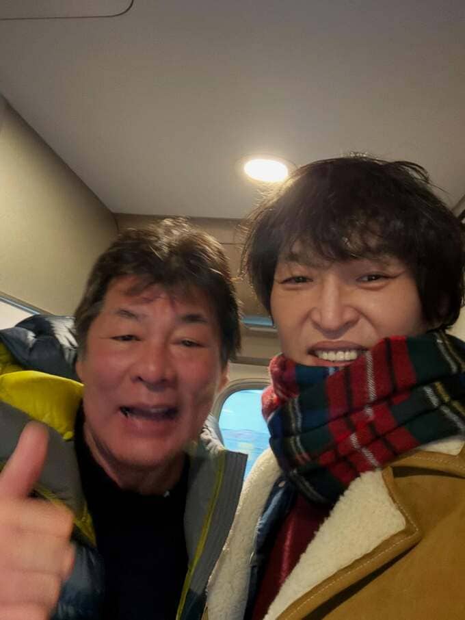 写真では、襟が蛍光イエローのダウンジャケットを着た赤井英和さんと、ベージュのコートに赤青のチェック柄マフラーを身につけた千原ジュニアさんが、車内で笑顔を見せています。二人はカメラに向かって肩を並べ、楽しげな様子が伝わってきます。