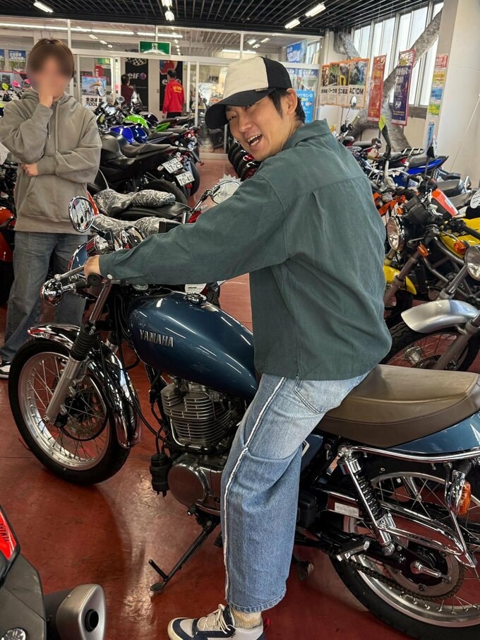 投稿された写真では、サンバーストカラーのヤマハ・SR400のハンドルを握り、真剣な表情を見せる石田さんの姿が。続く投稿では、鮮やかなブルーのSR400に跨り、一転して満面の笑みを浮かべています。