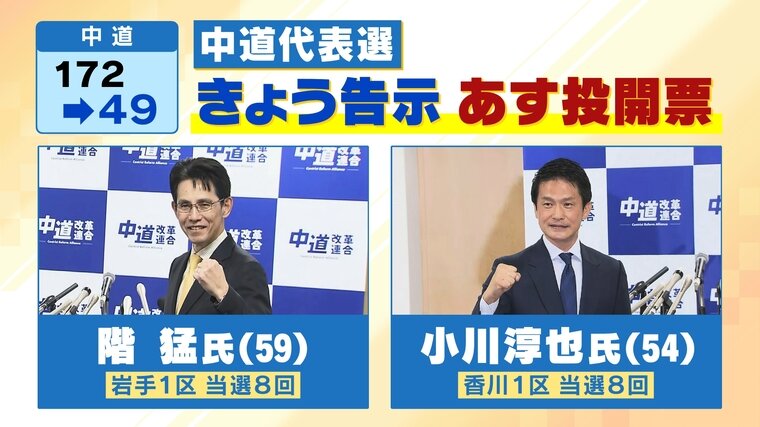 12日告示・13日投開票の中道代表選。岩手県出身で当選8回の階猛氏(59)と、香川県出身で当選8回の小川淳也氏(54)が出馬を表明しています。