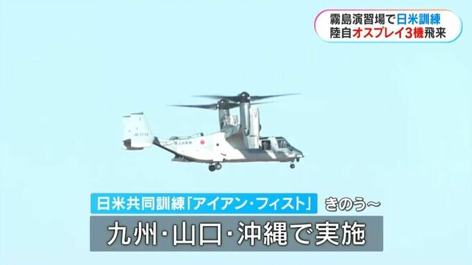 陸上自衛隊・霧島演習場で日米の共同訓練が始まり、12日は自衛隊の輸送機オスプレイ3機が演習場に飛来しました。
