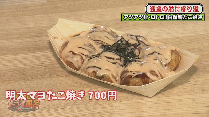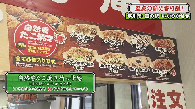 自然薯を使ったタコ焼きが販売されています。タコ焼きの生地に自然薯を練り込んでいて、トッピングのバリエーションも豊富です。大阪出身の新井アナは「たこ焼きはいっぱい食べたことありますが自然薯入りは初めて」と新鮮な様子。