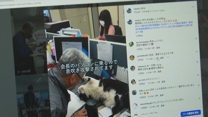 日章 石原司会長「可愛い孫のような癒しのにゃんこ。みんながみんな癒されている。お得意先などでいろんな会話の中でふくの話題が自然と出てくる。弊社の名前とかもコマーシャルになっている」