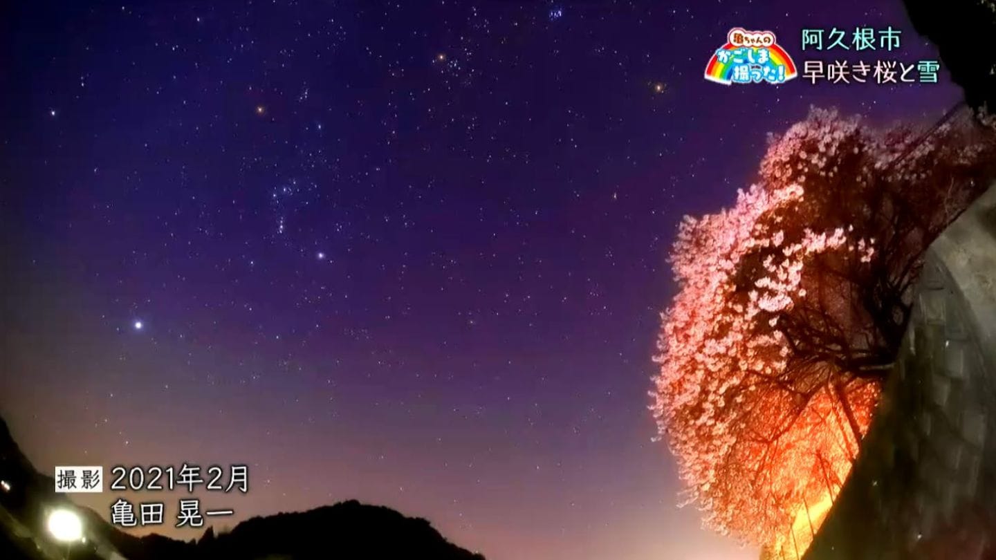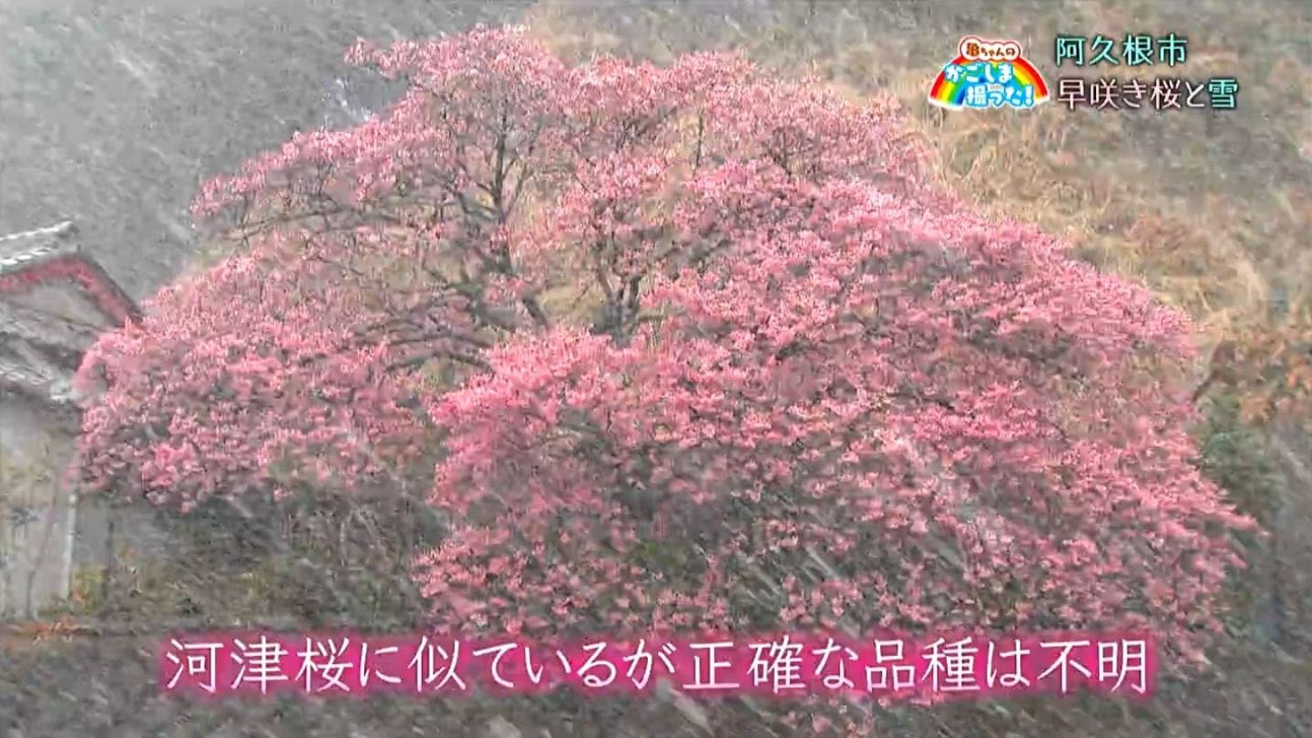 今回の映像は阿久根市からです。先日8日、日曜の大雪の日に、早咲きの桜を撮影してきました。冬と春が重なり合った風景もまた、風情がありました。