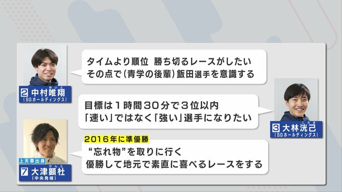 そのうち、青山学院OBで箱根駅伝9区・区間記録保持者の中村唯翔は「順位にこだわりたい」「(青学の後輩)飯田選手を意識する」と話しています。