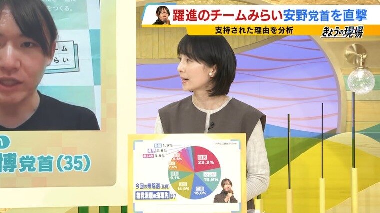 「また、(安野党首は)この選挙戦では『対政権』という対立軸を打ち出さずに、右でも左でもない未来志向なのだと話していました。そういった『分断を煽らない姿』に共感している人もいます」