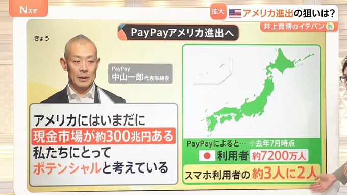 PayPayがアメリカへ進出するということで、PayPayの中山一郎代表取締役は、「アメリカにはいまだに現金市場が約300兆円ある。私たちにとってポテンシャルだと考えている」と述べています。