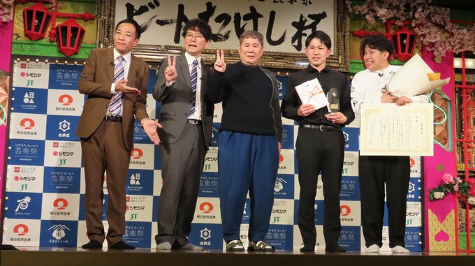 審査の前にはビートきよしさんがサプライズで登場し「ツービート」が浅草「東洋館」に集結。ともに審査を行った結果「スパイシーガーリック」が優勝しました。審査後には囲み取材が行われ、たけしさん、「スパイシーガーリック」とともに審査員を務めたナイツも登壇。