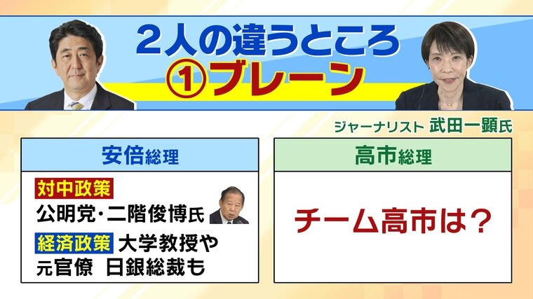 「安倍総理が作ったようなチームという意味ではあえて高市総理は作らないと思います。やはり自分が監督・主演・脚本「高市」というタイプなので。政策への思いは特に強いですから。国会運営や党のことはお任せすると思いますけど、保守的な政策でも経済政策でも、政策に関しては全て自分でやるというタイプですね」