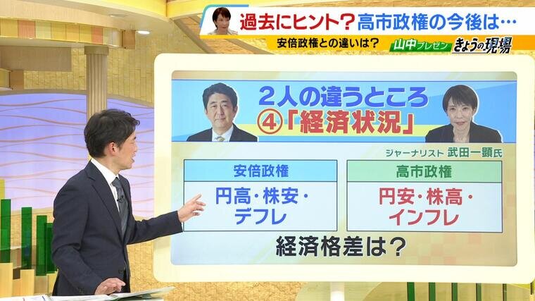 【高市政権】お手本は安倍政権?違いは「ブレーンの存在」「派閥の有無」「連立相手」「経済状況」政策実現にどう影響?大勝で得た"数"での強行採決は「トランプでいうジョーカー」【政治記者・今野忍さん解説】 毎日放送 2026年2月13日(金) 18:05 国内 2人の違うところ:④「経済状況」 ◆安倍政権 円高・株安・デフレ ◆高市政権 円安・株高・インフレ →経済格差をどうしていくか? 長期政権への実現のポイントは ①支持率 ②市場(マーケット) ③日米・日中関係 支持率はもちろんのこと、市場がどう反応するかや、日米・日中関係などが、高市政権が実現したい政策を推し進めるか、もしくは止めてしまうのか。注視していく必要がありそうです。 (2026年2月11日放送 MBSテレビ「よんチャンTV」より)