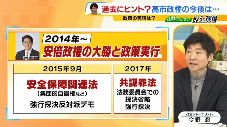 「そうですね。公約には書いてはいますが、『集団的自衛権やります』、『共謀罪やります』ということは街頭演説などで訴えてはいないんですよね。高市総理も同様で『スパイ防止法』や『皇室典範の改正』などはあまり街頭では言っていません。『責任ある積極財政』、これはアベノミクスと一緒ですよね」