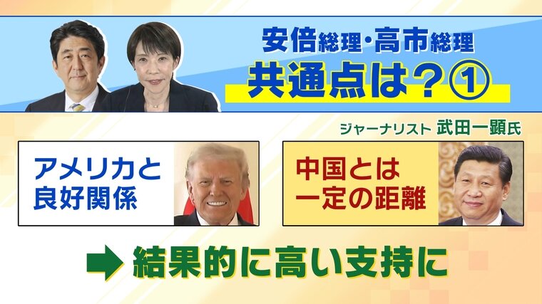 【高市政権】お手本は安倍政権?違いは「ブレーンの存在」「派閥の有無」「連立相手」「経済状況」政策実現にどう影響?大勝で得た"数"での強行採決は「トランプでいうジョーカー」【政治記者・今野忍さん解説】 毎日放送 2026年2月13日(金) 18:05 国内 高市政権のお手本は“師”と仰ぐ安倍政権か…共通点は? 次に、高市総理が師と仰ぐ安倍総理の共通点と違いを見ていきます(政治ジャーナリスト・武田一顕氏の見解を含む)。 ◆共通点 その① 「アメリカと良好関係」「中国とは一定の距離感」 →このことが結果的に高い支持につながっています。