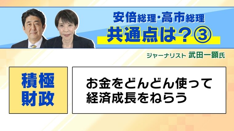 【高市政権】お手本は安倍政権?違いは「ブレーンの存在」「派閥の有無」「連立相手」「経済状況」政策実現にどう影響?大勝で得た"数"での強行採決は「トランプでいうジョーカー」【政治記者・今野忍さん解説】 毎日放送 2026年2月13日(金) 18:05 国内 共通点その③:積極財政 「積極財政」 お金をどんどん使って経済成長を狙う