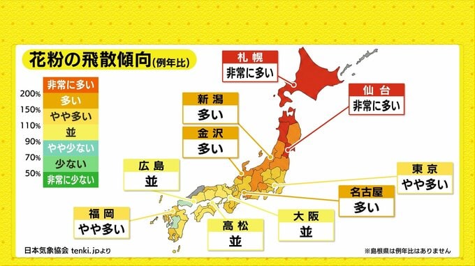 ただ、花粉の飛散量は昨夏の気温によっても左右されます。昨年の夏も猛暑が続きました。昨夏に高温多照の傾向が続いたことで、雄花が形成されやすい気象条件となっています。すなわち、県内の今年の花粉飛散量はおおむね平年並になる見込みです。