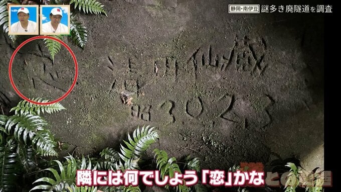 隧道の中はノミなどで削った跡が残る素掘りで、昭和初期に書かれた落書きの痕跡も。その奥は埋もれており、行き止まりになっています。