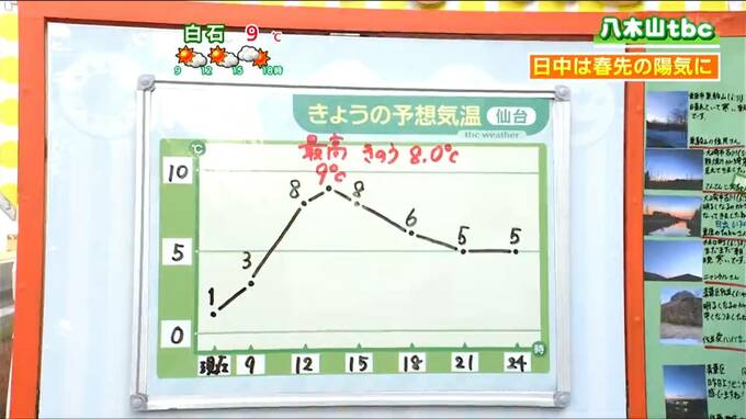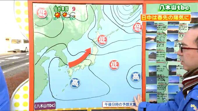南の高気圧から暖かな空気が入って、気温はまずまず上昇します。最高気温は仙台で9℃などと、12日と同じかやや高く、3月上旬から中旬並みまで上がりそうです。日中は手袋やマフラーなどがなくても過ごしやすいでしょう。