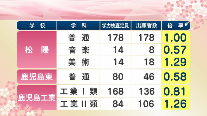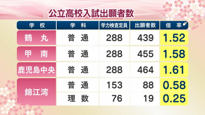鹿児島県公立高校入試倍率【全校掲載】高倍率は鹿児島南(体育)、玉龍、鹿児島中央、甲南、鶴丸【令和8年度高校受験志願倍率と出願者数】2026 南日本放送 2026年2月13日(金) 14:52 国内 鹿児島学区 鹿児島学区は鶴丸、甲南、鹿児島中央、錦江湾、武岡台、開陽、明桜館、松陽、鹿児島東、鹿児島工業、鹿児島南、吹上、伊集院、市来農芸、串木野、鹿児島玉龍、鹿児島商業、鹿児島女子です。