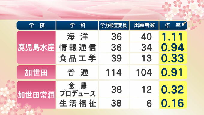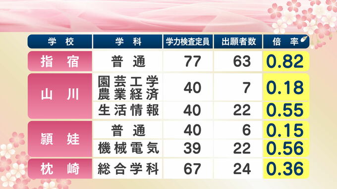 鹿児島県公立高校入試倍率【全校掲載】高倍率は鹿児島南(体育)、玉龍、鹿児島中央、甲南、鶴丸【令和8年度高校受験志願倍率と出願者数】2026 南日本放送 2026年2月13日(金) 14:52 国内 南薩学区 指宿、山川、穎娃、枕崎、鹿児島水産、加世田、加世田常潤、川辺、薩南工業、指宿商業です。