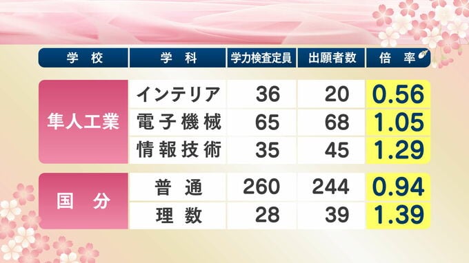 鹿児島県公立高校入試倍率【全校掲載】高倍率は鹿児島南(体育)、玉龍、鹿児島中央、甲南、鶴丸【令和8年度高校受験志願倍率と出願者数】2026 南日本放送 2026年2月13日(金) 14:52 国内 姶良・伊佐学区 大口、伊佐農林、霧島、蒲生、加治木、加治木工業、隼人工業、国分、福山、国分中央です。