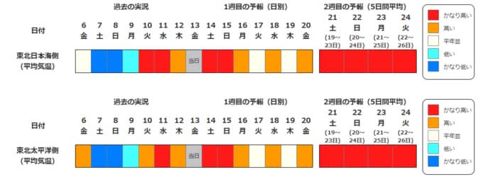 東北地方の向こう2週間の気温は、寒気の影響を受けにくいため高い日が