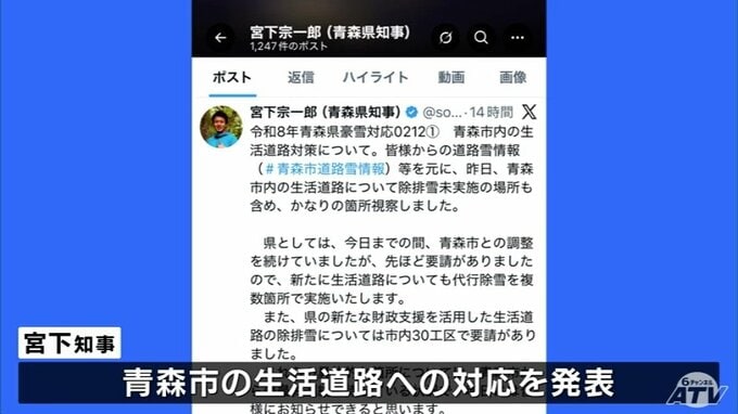 除雪遅れの青森市 青森県が代行除雪を新たに生活道路の複数か所で実施へ 宮下宗一郎知事 "市には現実を直視した実効性ある対応を重ねて求めていきたい" 青森テレビ 2026年2月13日(金) 11:36 国内