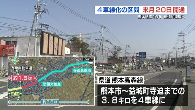 熊本県益城町で進められてきた県道の4車線化工事が完了し、3月20日に全線で開通することが明らかになりました。県は、熊本地震からの「創造的復興」の重点事業として、県道熊本高森線の熊本市から益城町寺迫までの3…