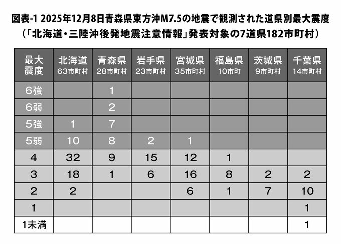 2025年12月8日午後11時15分に発生した「先発地震」(青森県東方沖を震源とするM7.5(Mw7.4)の地震)で観測された道県別の最大震度を図表-1に、津波警報や津波注意報などの発表状況を図表-2にまとめた。浮かび上がった特徴の幾つかを以下に記す。