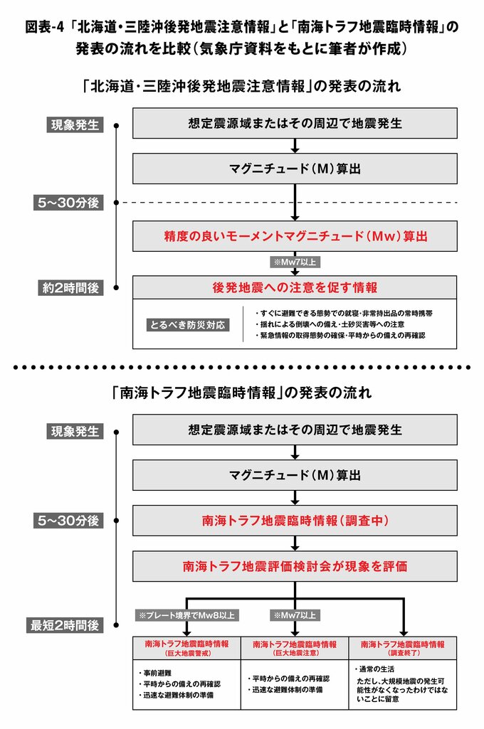 けれども2つの情報の流れを比較すると(図表-4)、「臨時情報」に付されている「調査中」「巨大地震警戒」「巨大地震注意」「調査終了」の4つのキーワードが「後発地震注意情報」には存在しないなど大きく異なる点があり、実は似て非なる情報といえる。