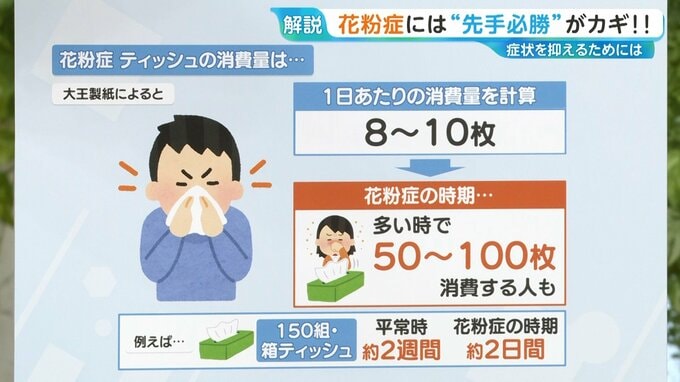 大王製紙が計算したところ、1日あたりのティッシュの消費量は8枚〜10枚ですが、花粉症の時期には、多いときで1日に50枚〜100枚消費する人も少なくないようです。