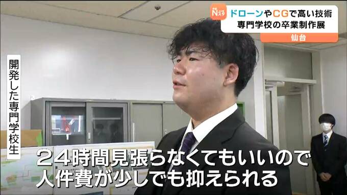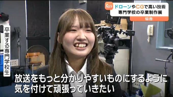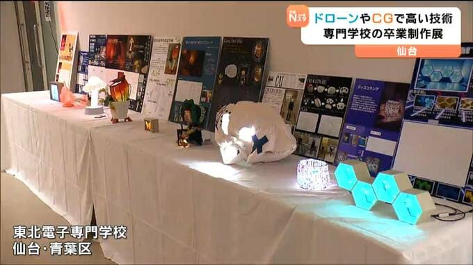 卒業を控えた学生の力作がそろいました。東北電子専門学校の卒業制作展が仙台で始まり、ドローンやCGを使った完成度の高い作品が展示されています。