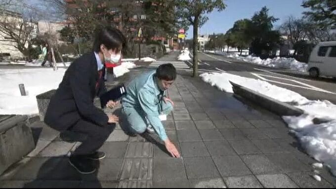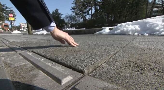 金沢市の第2庁舎前。平板ブロックのガタつき、段差が生じ、歩行者がつまずくことも考えられる状況。