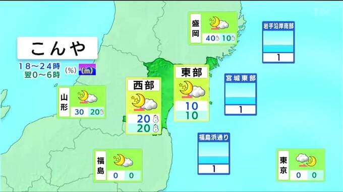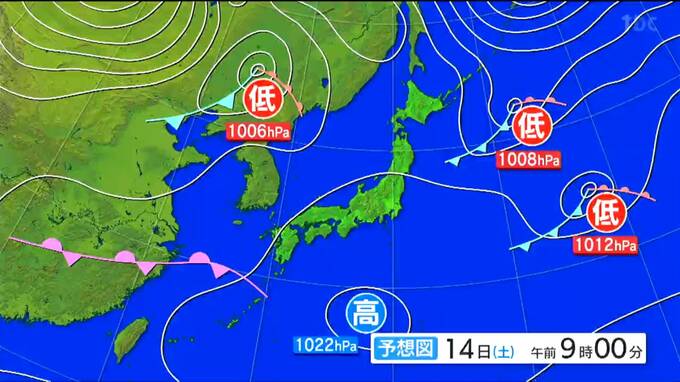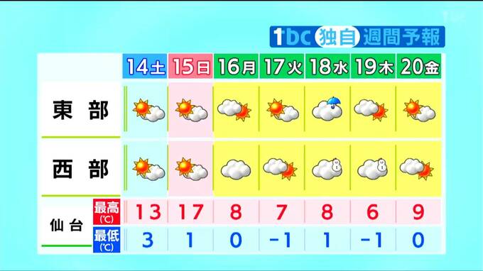 朝の冷え込みは弱く、最低気温は2℃から4℃と、13日朝より3℃前後高いでしょう。最高気温は、白石で14℃など、朝・日中とも3月下旬から4月上旬並みの見込みです。