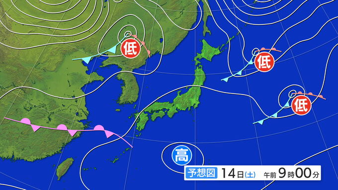 14日(土)午前9時の予想天気図です。日本付近は高気圧の影響を受けそうですが、大陸から東シナ海にのびる前線で九州など西日本では雨の降る所もあるでしょう。
