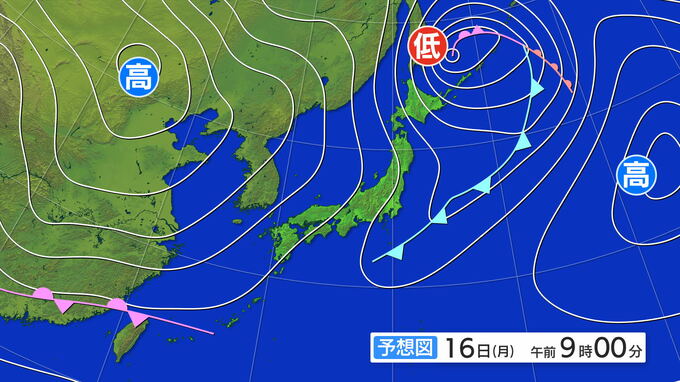 16日(月)午前9時では、低気圧が千島付近へと進み、一時的な冬型の気圧配置になりそうです。