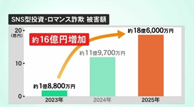 またSNS型投資・ロマンス詐欺はおよそ18億600万円と16億円増加しました。