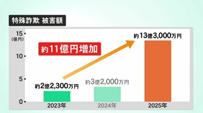 2025年1年間の県内の特殊詐欺の被害は、およそ13億3000万円と2023年に比べ11億円増加しました。