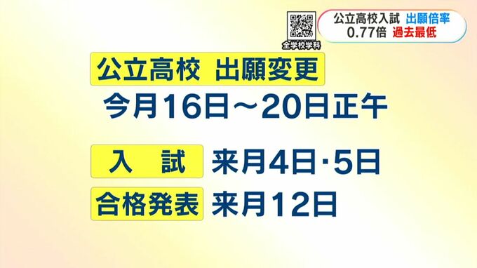 公立高校の出願変更は来週16日から20日の正午までです。入試は来月4日と5日に行われ、合格発表は来月12日です。全ての高校と学科の出願倍率は画像で掲載しています。