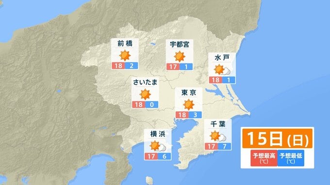 15日(日)はさらに気温が上がり、4月並みの陽気ですが、来週前半は「強い寒の戻り」で、関東南部でも「雪」が降るところがありそうです。