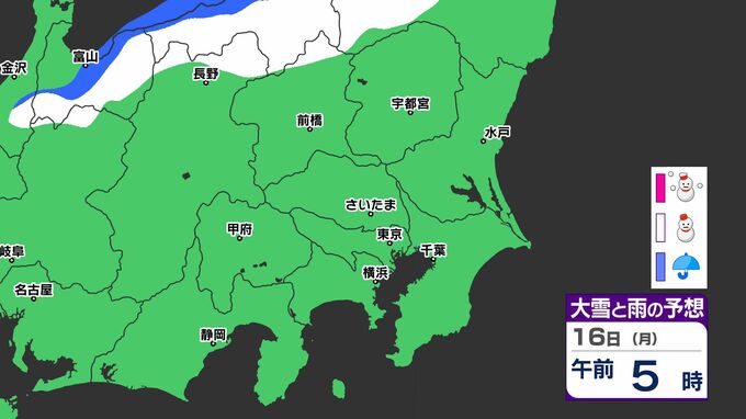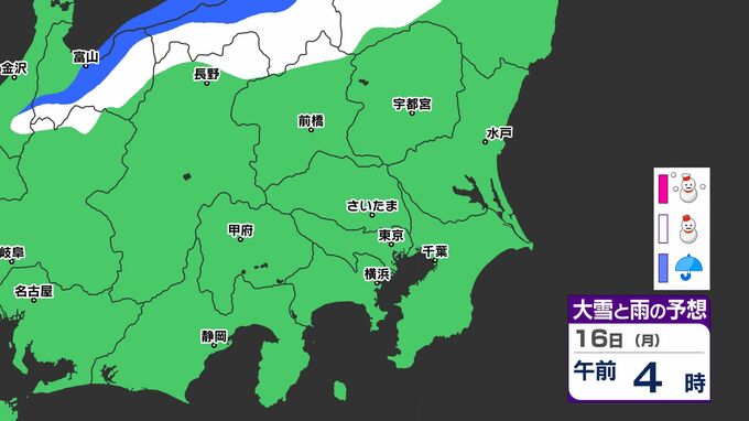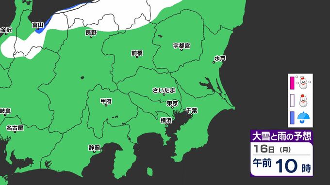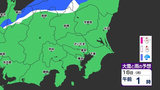 【東京首都圏 また雪か?】暖かい日曜日の後は「強い寒の戻り」【雪シミュレーション16日(月)~17日(火)】/ 関東各都市の週間予報】東京・神奈川・埼玉・千葉・群馬・茨城・栃木・山梨・長野 南日本放送 2026年2月13日(金) 19:30 国内 天気 雪シミュレーション16日(月)~17日(火) 16日(月)夜には、東京都心で雪が予想されています。 シミュレーションは実際の降り方と異なったり、実際よりも広く予想されることがあります。気象庁から発表される最新の気象情報を確認してください。 この記事をはじめから → 【東京首都圏 また雪か?】雪シミュレーションと関東地方の週間予報