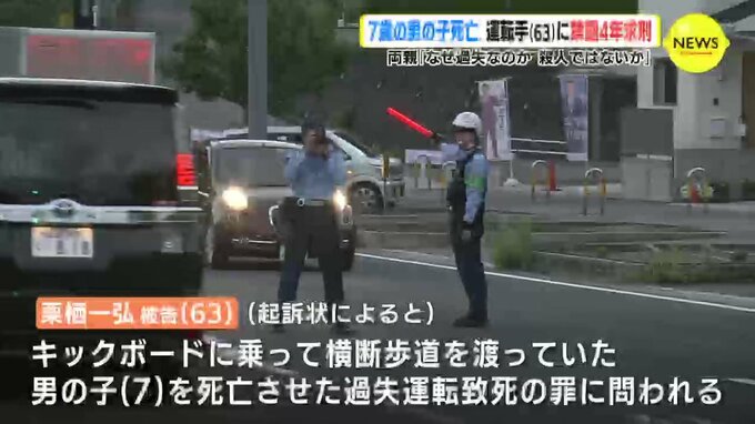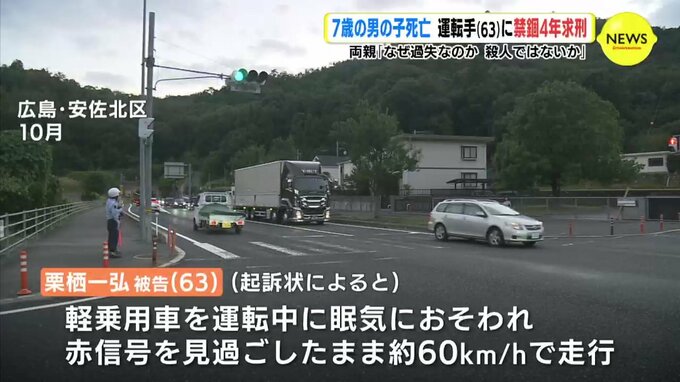 起訴状によりますと広島市南区の栗栖一弘被告(63)は、ことし10月広島市安佐北区可部の国道54号で、軽乗用車を運転中に眠気におそわれ、赤信号を見過ごしたまま時速およそ60キロのスピードで進行し、キックボードに乗って横断歩道を渡っていた7歳の男の子をはね、死亡させた罪に問われています。