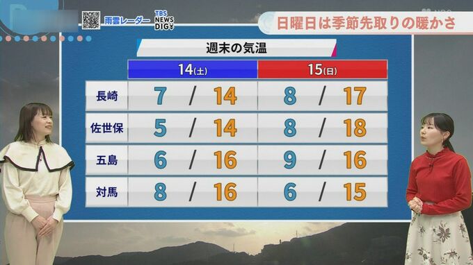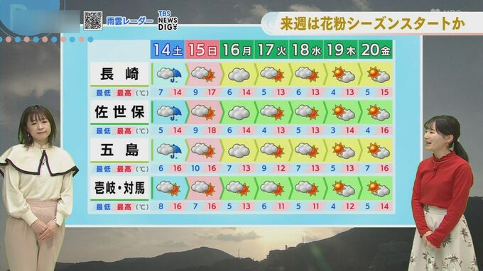 この暖かさも一転、あす14日(土)は天気が下り坂となる見込みです。前線の影響で雲が広がり、午後から南部や北部、五島を中心に雨が降り始めるでしょう。本降りの時間もありますが、全体で10ミリくらいの降水量となりそうです。あす朝の気温は6度前後と今朝よりも少し高めで、日中の最高気温は14度から16度の予想。今日と同じくらいの気温ですが、雨や曇りで日差しが遮られるため、今日ほどポカポカとは感じられないかもしれません。
